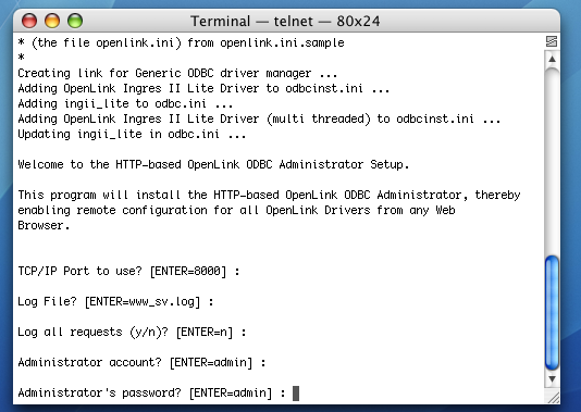 You can change the iODBC Data Source Administrator's default password from "admin."