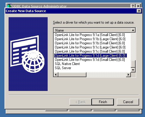 3. Click the Add button. Then, select the OpenLink "Lite" Driver for Progress (SQL-89) from the list of available drivers. Select the Unicode version of the driver if and only if you are working with multi-byte character sets, as unnecessary translations can significantly affect ODBC performance.