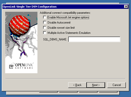 • Enable Microsoft Jet engine options — Facilitates translation of certain data types for the Microsoft Jet Engine. If you notice that money and other datatypes are mishandled with Microsoft or other applications, test with Jet fix enabled.