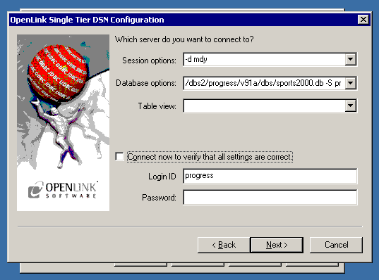 • Database Options — Passes Progress socket options and the full path to the Progress database. For example: