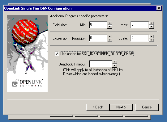 • Deadlock Timeout — Deadlock Timeout sets the number of seconds that OpenLink's database agents will wait for the Progress server to release its lock before the agents return an error to the client.