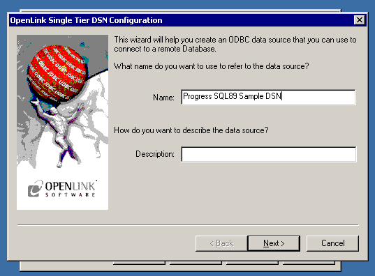 5. The first dialog prompts for a Data Source Name and optional description.