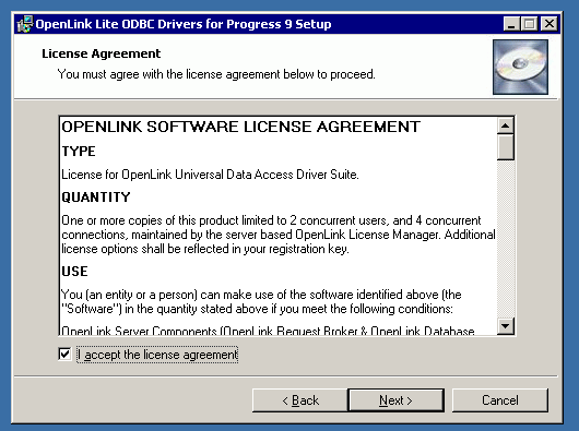 4. The next screen will display the License Agreement for the OpenLink Lite Driver. Please read and check the "I accept the license agreement" checkbox. Then, click Next.