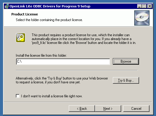 5. The driver needs a license file to operate. Click the Browse button to locate a commercial or evaluation license that you have previously downloaded onto your local hard drive. Alternatively, click the Try & Buy button to obtain a commercial or evaluation license. You can also tick the "I don't want to install a license file right now" check box. This option will permit you to install the product; however, you will not be able to use the product until you obtain a commercial or evaluation license key.