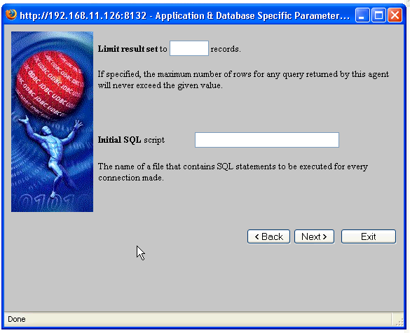 - The third Application & Database Specific Parameters dialog allows you to limit your rowset size and pass an initial SQL script.