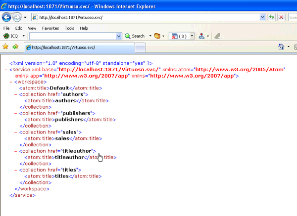Important - To view Atom (the default format returned by an ADO.NET Data Service) in Internet Explorer, you must first ensure that Feed Reading View is turned off.