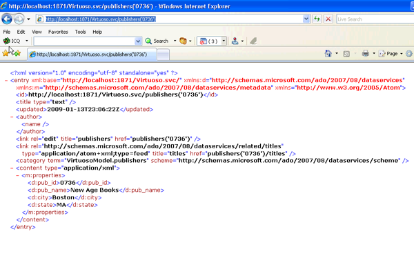To access a specific entity instance like the publisher table publisher number 0736 record, use this convention: http://host/vdir/Virtuoso.svc/publishers("0736").