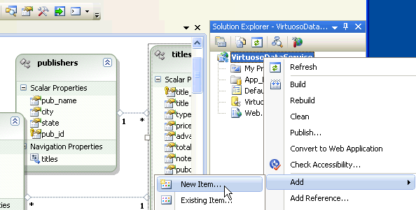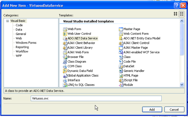 Give it the name Virtuoso.svc and click Add to create the ADO.Net Data Service.