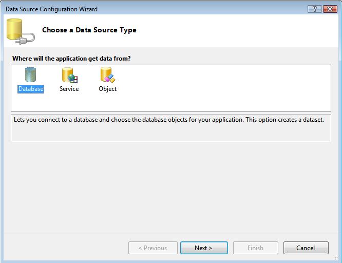 In the Data Source Configuration Wizard dialog Choose Data Source Type page, select the Database data source type and click Next.