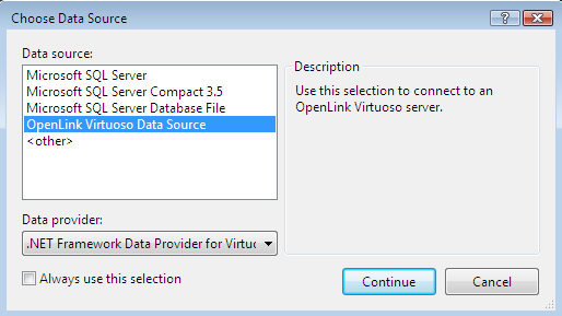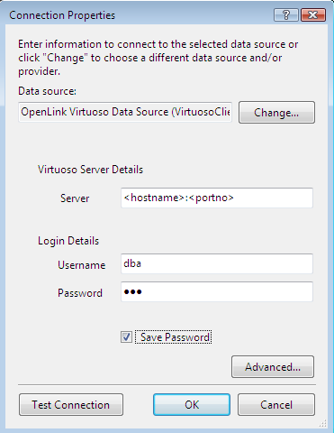 In the Connection Properties dialog, specify the hostname, portno, username, and password for the target Virtuoso Server and click the Advanced button.