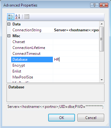 In the Advanced Properties dialog, set the Database parameter to HR and click OK.