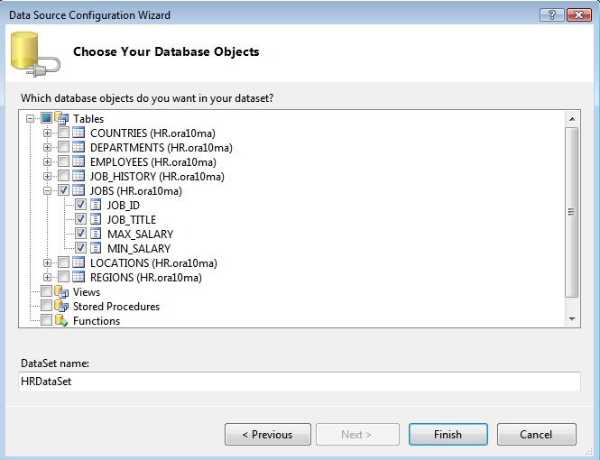 From the list of available tables returned for the HR database, select the JOBS table to be associated with the