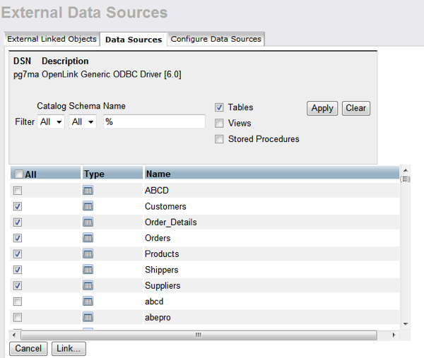 On successful connection, select the Link Objects button to obtain a list of available tables.